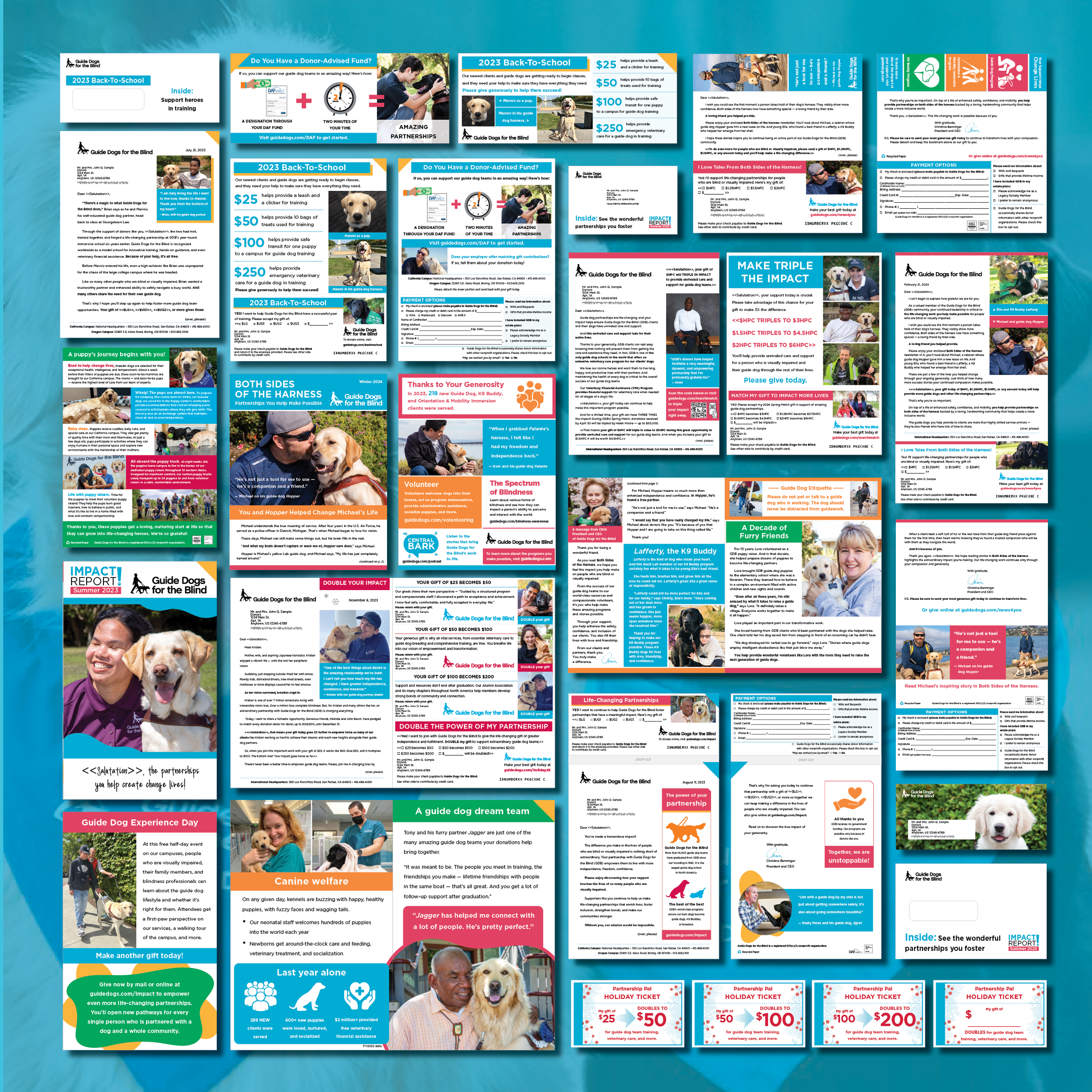 Guide Dogs for the Blind (GDB) is a leading guide dog school that breeds and trains service dogs for individuals with visual impairments. From 2023-2024, we undertook a complete overhaul of their print materials, redesigning everything from the ground up. Working closely with GDB, we stayed true to their brand and style guidelines while reinventing their direct mail materials. The result was a highly successful collaboration that brought their vision to life and increased donations.
